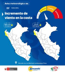 El Senamhi informa que, del miércoles 19 al jueves 20 de marzo, se presentará el incremento de la velocidad del viento, de moderada intensidad, en la costa. Este incremento podría generar el levantamiento de polvo/arena y la reducción de la visibilidad horizontal. Además, se espera cobertura nubosa con niebla/neblina en sectores cercanos al litoral hacia la madrugada y las primeras horas de la mañana.