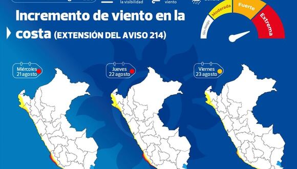 El Senamhi informa que, a partir del miércoles 21 al viernes 23 de agosto, continuará el incremento de la velocidad del viento, de moderada hasta extrema intensidad, en la costa. Este incremento podría generar el levantamiento de polvo/arena y la reducción de la visibilidad horizontal. Además, se espera cobertura nubosa con niebla/neblina, sensación de frío y llovizna hacia la madrugada y las primeras horas de la mañana.