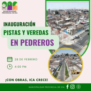 Invitación: Sábado 28 de febrero 2026: Hora: 04:00 pm Inauguración: Nuevas pistas y veredas Urb. Pedreros.