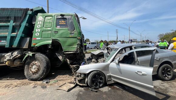 Por su parte el camión volquete de placa C41-877 cargado de material para construcción quedó encima del auto, y esta unidad pesada tiene como propietarios a Máximo Bonifacio y Elma Reyes, finalmente el tráiler de placa AMA-902 color rojo quedó atravesado en la vía de tránsito rápido y según información pública de la Sunarp pertenece a la empresa Transportes Fortaleza SRL.